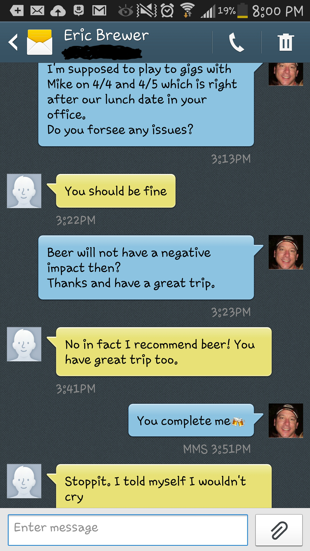 NOTE: Pretty cool, Hammy had just sent me a text when I took the screen shot for this. You can read it at the top. He added me to his Church’s prayer list. Coincidence? Nope. “You are….in good hands.” – Thank you Hammy, You’re a good man.
