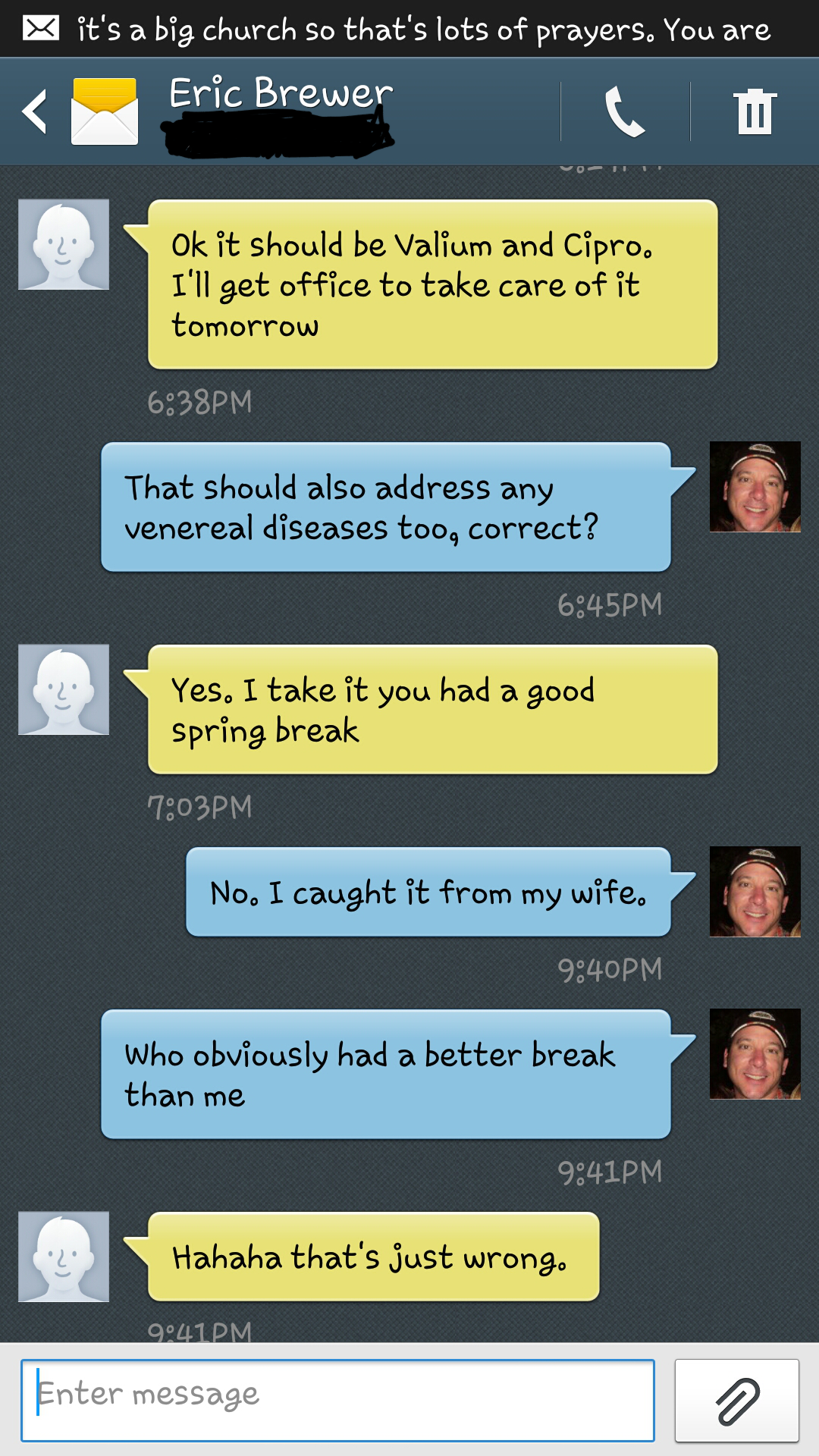 Just the name of the enema is funny. “Fleet”. Have fun with that for a minute. I am texting Eric, Tuesday night before the surgery. I am at the pharmacy picking up my “Fleet” two pack. I decided to get the two pack. Better to have too much than not enough. Only the valium was there. No antibiotics had been either called in or received. It doesn’t really matter. The last thing I did when I left Eric’s office a couple of weeks ago was “pick up my shield and ready my dagger”. I send him a text…here is our exchange: